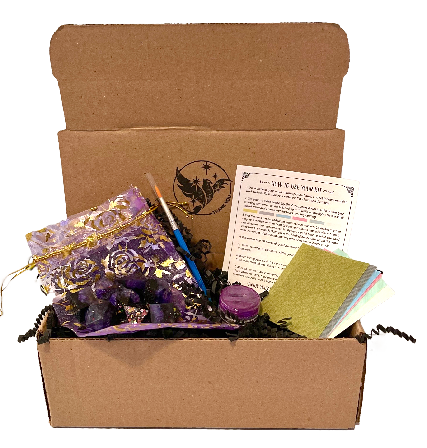 The kit comes with: 9 piece RAW set of dice, full set of Zona papers, a paintbrush, a small container of a paint color of your choosing, and instructions on how to use your kit! I always throw in a freebie surprise too!