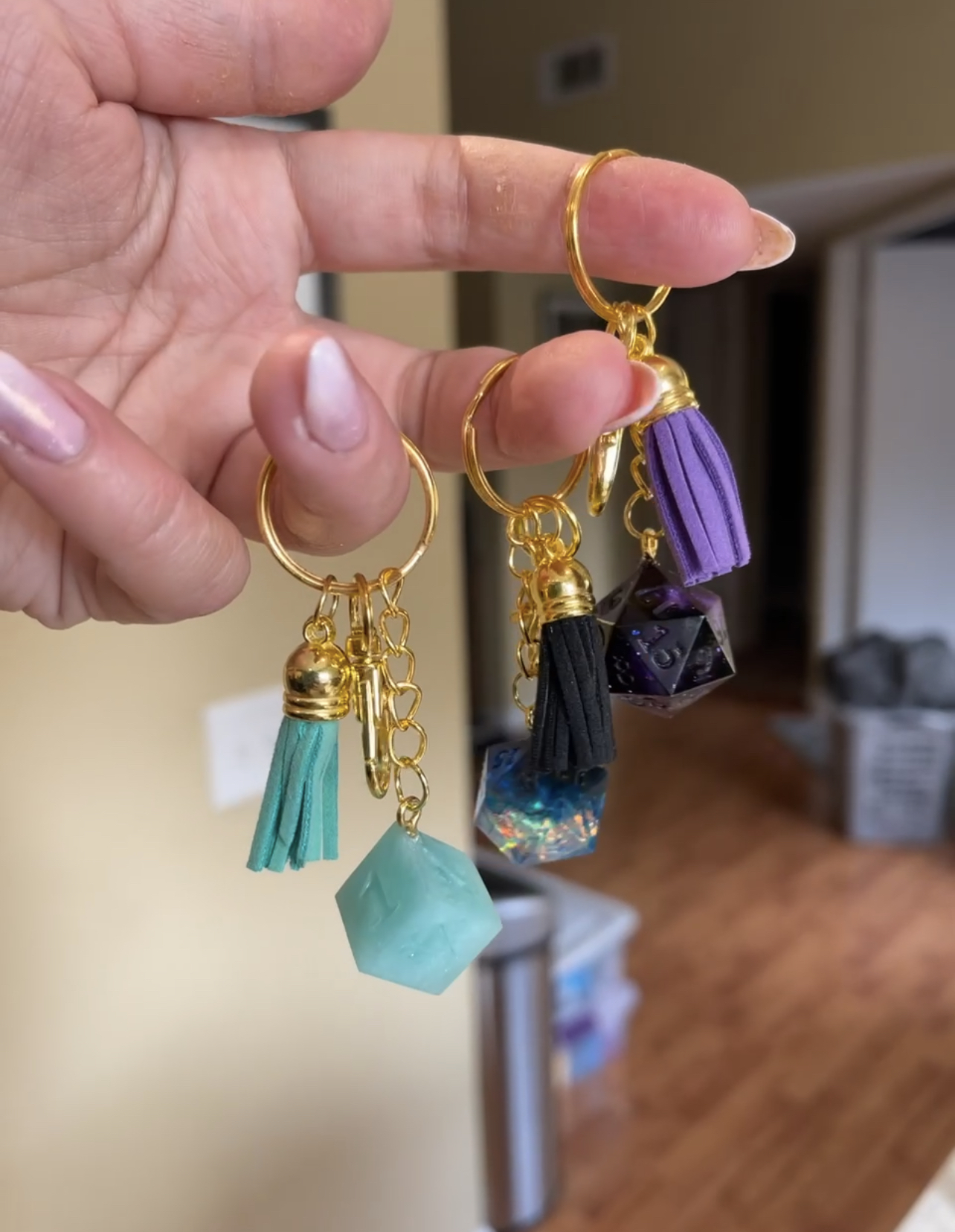 Add a cute keychain to your order! Select from the available general color options, and I will add a keychain to your order with that color tassel, and a dice that matches. Dice keychains are made with RAW “fail” dice. This just means that they didn’t make the cut to be part of a full set. A face may have been too lifted, a number shifted too far off to a side, a large air bubble, etc. They’re still gorgeous little math rocks that found a way to still be beautiful and useful! Dice keychains do not have inked numbers.